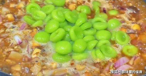 14.炒出香味后,放一碗清水,倒入豌豆窝窝,加入鸡汁、蚝油、食盐,翻炒均匀。
