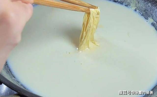 5.开大火煮开后,转小火继续煮5分钟,关火,用筷子夹起表面这层油膜,晾干后可做成腐竹。