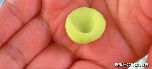 9.用保鲜膜盖住,防止灰尘和风干,捏出一小颗面团,放手心搓圆,再用指尖搓出一个窝窝,这样一个豌豆窝窝就做好了。