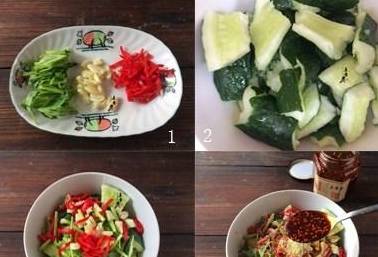 材料:黄瓜2根、蒜头3瓣、红辣椒1个、细芹1根、