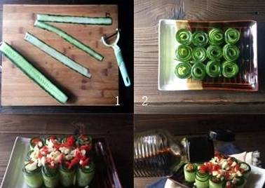 2.把黄瓜薄片条卷起来,排列在型