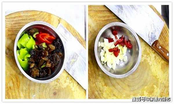 3.准备好的木耳放入清水中进行泡发,青红椒去籽后切成三角片,大葱白切成马蹄片,生姜切成薄片,大蒜切片,在抓入5克左右的干辣椒段。