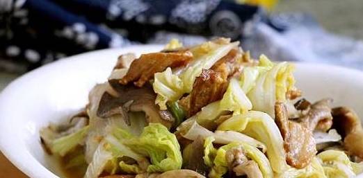 锅烧热,不放油,放入白菜片大火炒,白菜会出水,用饭勺舀出倒掉,炒到没有水分,白菜装盘里备用。锅内加植物油,温热的时候放入肉片中火炒至发黄、出油,加葱姜末炒出香味,放酱油提色,倒入蘑菇大火炒几下,放盐。翻炒至蘑菇发蔫,会出好多汤,接着大火收收汁至少许。
