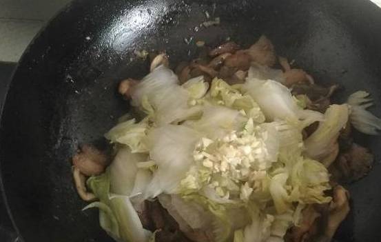 倒入白菜片、蒜末大火炒到均匀、蒜出香味。美味的一盘炒白菜就出锅啦。平时肯定是吃酸辣白菜最多吧,但是婆婆加入了香菇和五花肉,这样炒出来的白菜更香,每次我都能吃很多。