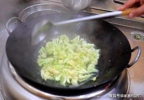 锅中烧水,加入少许食盐入底味,水烧开以后倒入花菜,淋入少许植物油锁住花菜中的营养,大约焯水1分钟,花菜断生以后倒出来控水备用,这一步是为了让花菜生熟一致。