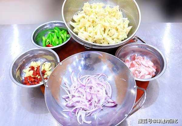 准备花菜一大朵,去除硬根,切成小块放入清水中洗干净;五花肉一小块,切成薄片。