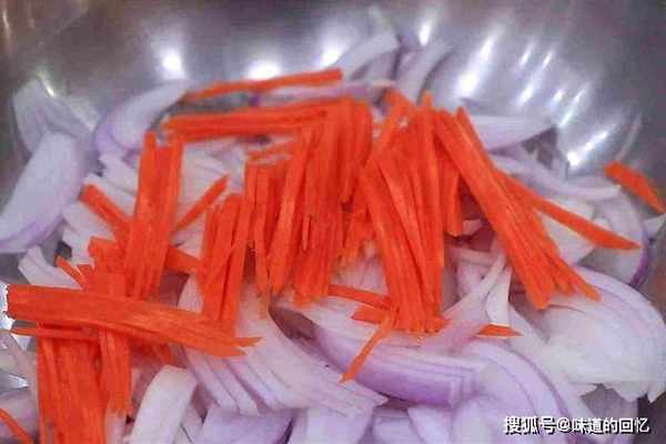 胡萝卜一根,切成丝放入盆中,洋葱半个切成丝也放进去。