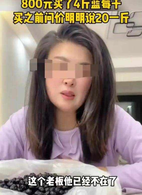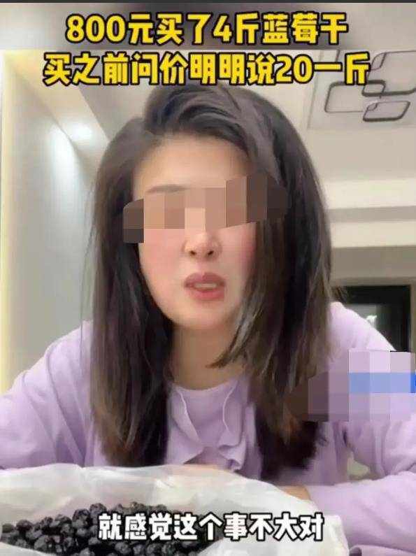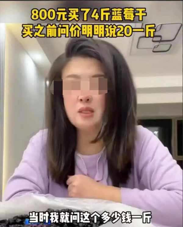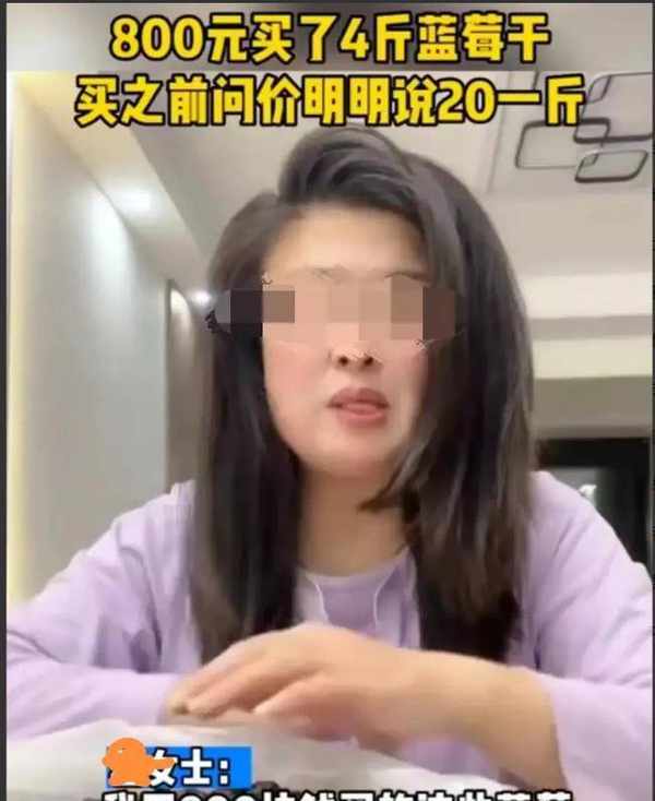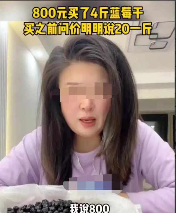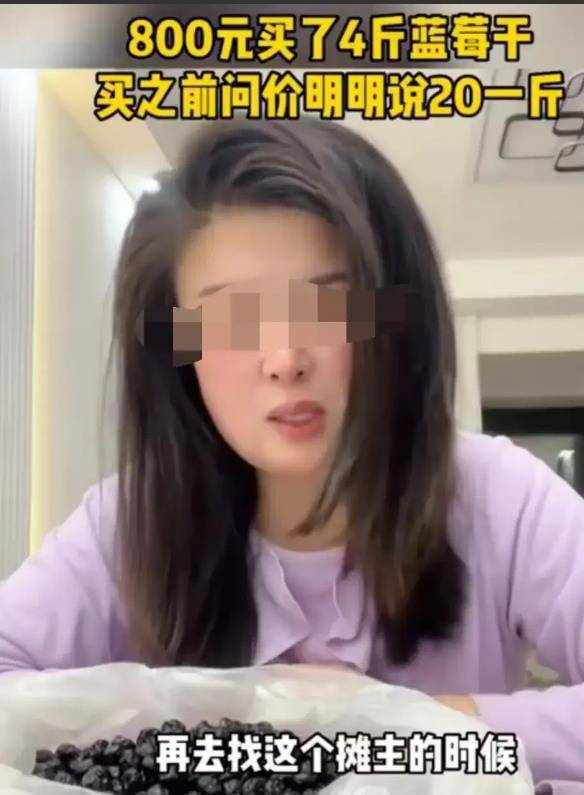 山东烟台,女子看到路边摊上卖的蓝莓干不错,询问老板价钱,老板回答说,20元。随后,女子就称了一些,算账的时候,老板要800元。等到女子回家后,感觉有点不对劲,称了一下重量,发现竟然只有4斤!事情的经过是这样的,曲女士平常生活中喜欢吃零食,对于一些具有保健功效的食物,比如水果类,更是情有独钟。另外,曲女士的收入不错,所以,平常生活中的消费水平也算比较高。