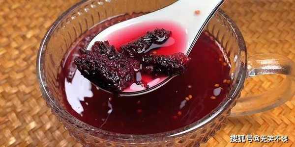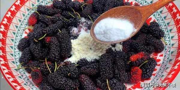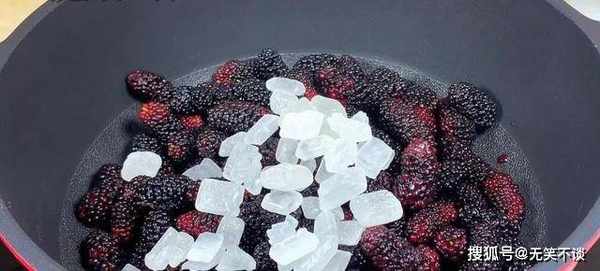 5.全部处理好之后倒入锅中,再倒入适量100克冰糖,开大火煮,一边煮一边翻炒,防止糊锅粘底。桑葚味甘酸性寒,归心、肝、肾经,铁元素含量非常高,是铁元素含量最丰富的天然水果之一,因此适当吃一些桑葚,能起到很好的补血养血的效果。