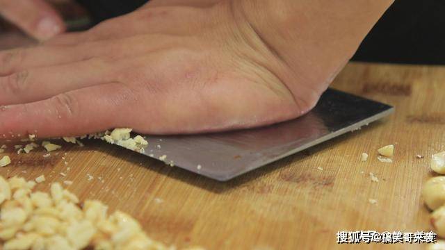 剥好以后用刀背把花生米压成花生碎,放在盆中。
