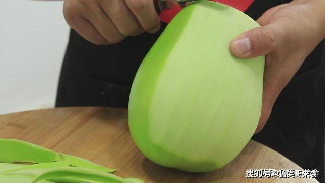 花生米炸好以后,我们把青茄子削干净外皮。