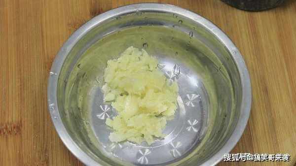 大蒜几粒切去根部,然后放在蒜臼子里面捣成蒜泥,挖出放在盆中。