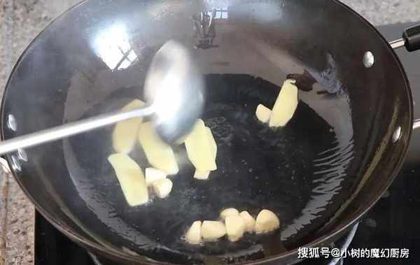 4、热锅,放油,大蒜和姜片爆香。