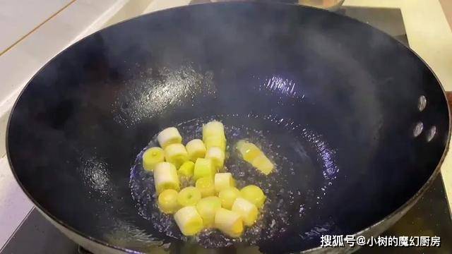 3、接着热锅放油,爆香蒜段。