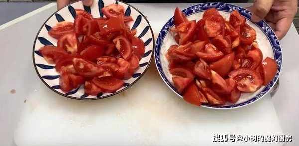 3、接着将番茄切块,分成两份。