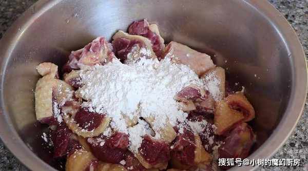 1、鸭肉切块放碗中,加点生粉搅拌清洗干净,可以去掉血腥味,就不用腌制了。