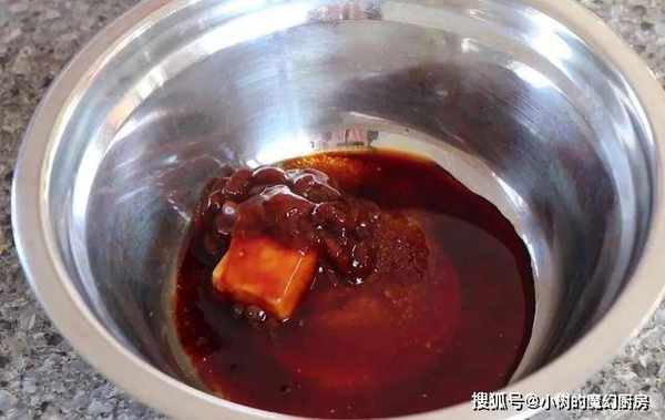3、准备一碗调料,碗中放腐乳、食盐、白糖、豆瓣酱、生抽、老抽、胡椒粉,搅拌混合。