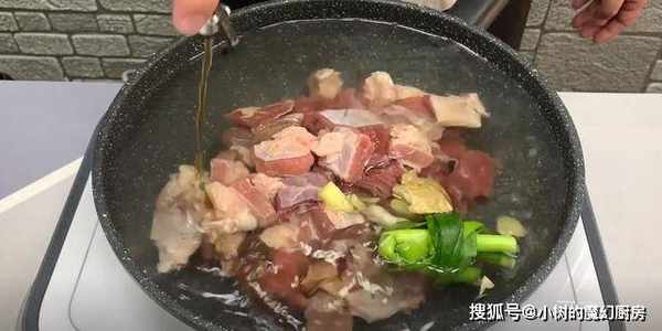 1、首先将牛肉切块,冷水下锅,放葱段、姜片、料酒去腥,大火烧开焯水3分钟捞起。