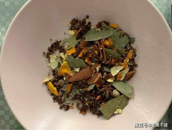 2、碗中加入八角5个,茴香10克,香叶5片,桂皮1块,花椒20粒,1块陈皮,白寇4个,尽量弄得碎一些,如图所示。