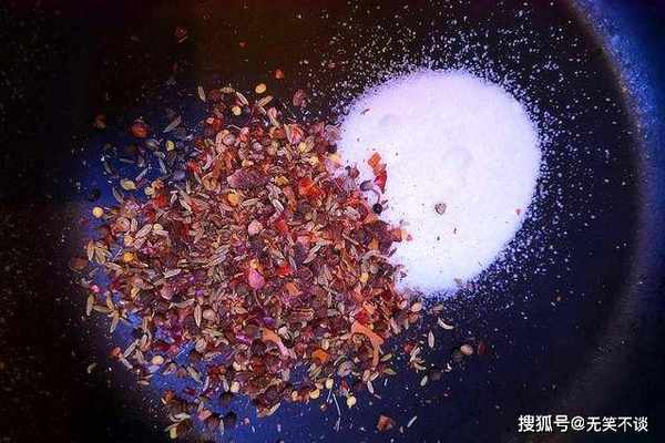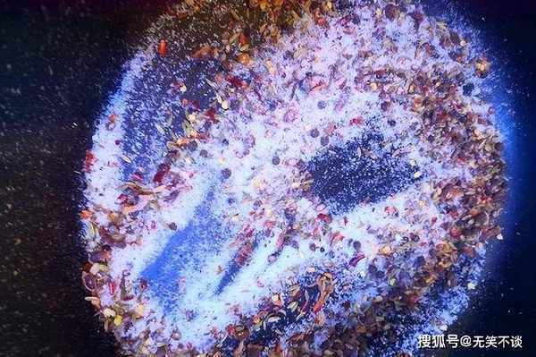 3、开火放锅,不放水也不放油,倒入400克食盐,把这些配料倒入锅中,小火翻炒,一直炒出香味,炒大约8分钟,关火晾凉。