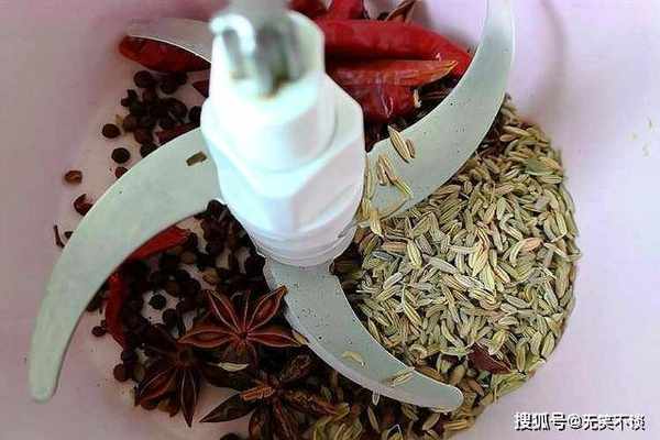 3、接下来就是准备辅料了,料理机中加入,花椒10克,八角10克,干辣椒10克,小茴香10克,香叶2克,桂皮5克,转一转打成碎末。