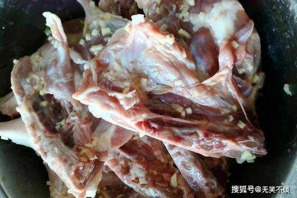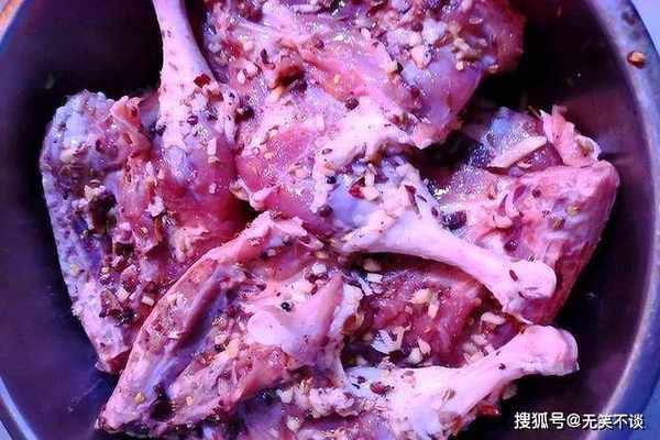 6、此时的鸭腿也腌得差不多了,腥味已经去除干净,把调料粉抹在鸭腿上。