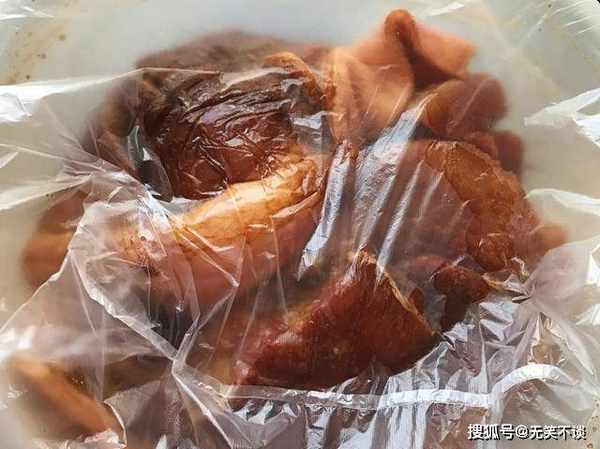 6、按摩均匀后,盖上一层保鲜膜,把肉密封在盆里面,再准备一个重物压在上面,让肉充分吸收咸味,一般腊月腌制,天气已经非常寒冷了,一定要处在零下的环境,千万别放在带暖气的房间中腌。