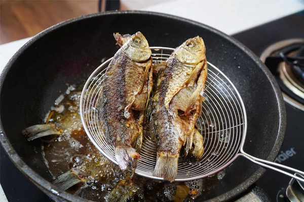 3、锅内加油,油温六成热后,将腌制好的鱼放入油炸,中小火炸8-10分钟,炸透,炸酥,气泡比较少时捞出控油,油温八成热后,复炸1分钟至酥脆捞出备用。