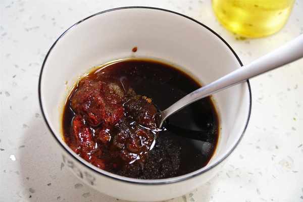 2、加入2勺郫县豆瓣酱,2勺甜面酱,3勺生抽,2勺糖,1勺陈醋,2勺高度白酒,适量的盐搅拌均匀,做成调味料备用。