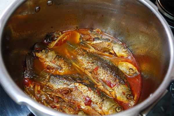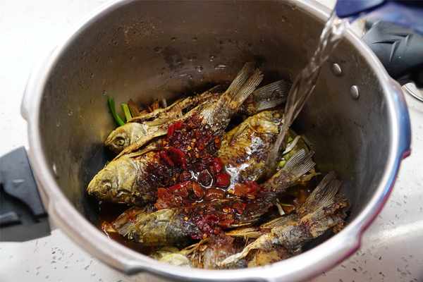 4、高压锅底部摆入一些葱段、姜片,将炸好的鱼一条条排放在里面压平整,把第二步制作的料汁倒入,加入刚好淹没鱼的清水,盖上锅盖焖煮20分钟。