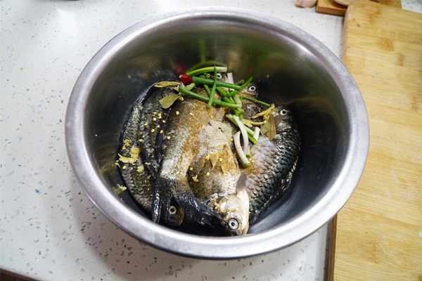 1、鲫鱼收拾干净放入盆中,加入一些姜蓉、小葱段,1调羹五香粉和胡椒粉,适量的底盐,干辣椒切碎抓匀了将鱼腌制30分钟。