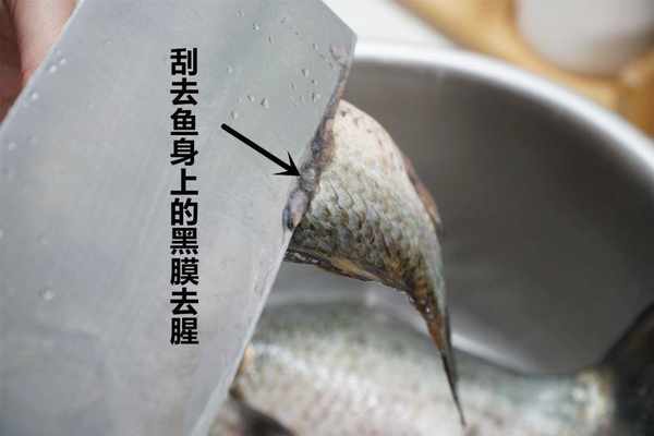 1、鲫鱼处理好了鱼鳞和鱼内脏,刮掉鱼皮上的黑膜,把鱼鳍减掉,把鲫鱼里外冲洗干净,给鱼的两面改上花刀,用厨房纸把鱼表面的水分擦干,给鱼的两面少量的抹上一层油。姜去皮切片,小葱清洗干净,一部分打成葱结,另一部分切葱花备用。