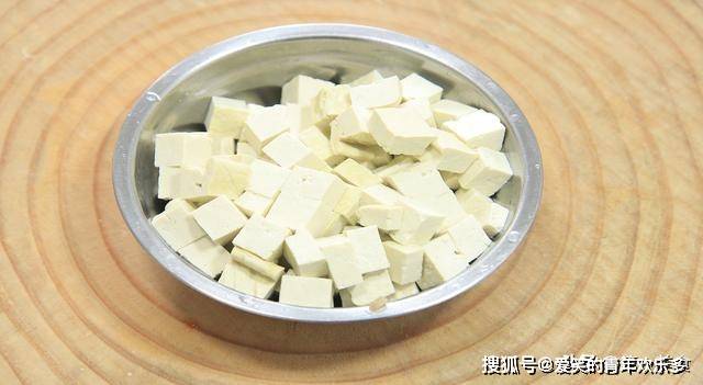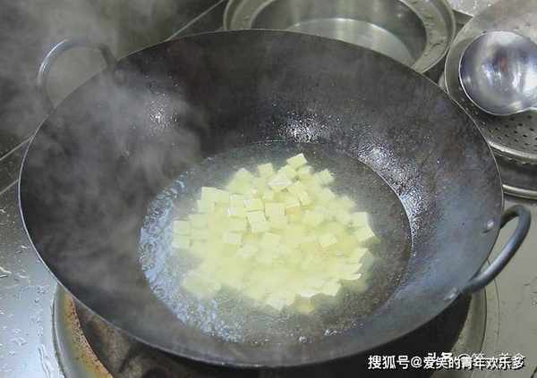 ,少许植物油,水温接近90度,倒入豆腐块,开小火,把水煮至沸腾,水开以后,捞出豆腐冲洗控干水分。