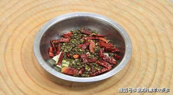 生姜一小块先切成姜片,再切成姜末,大蒜几粒拍扁后切上几刀,小盆中抓入一小把干辣椒 ,一小把青花椒。
