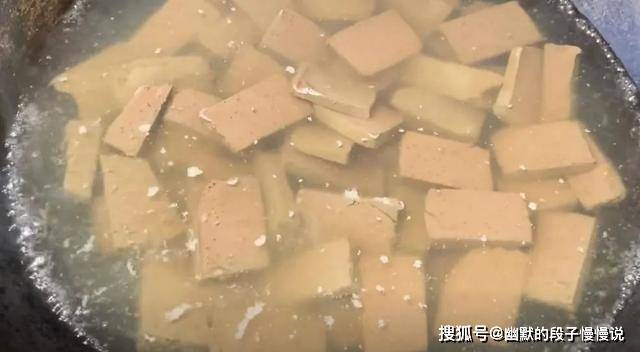 3、烧开热水,倒入羊血给他焯水,一分钟后捞起。焯水有助于给羊血定型,炒的时候不容易变烂。?
