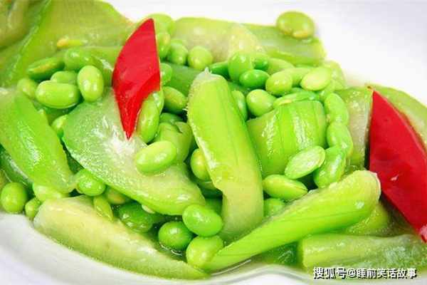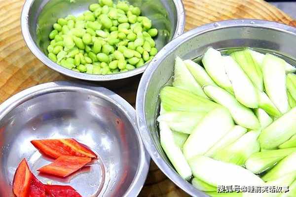 丝瓜外皮后切成均匀的滚刀块,用淡盐水泡上;红椒半个切成菱形片,用来配色;再准备新鲜的毛豆籽100克备用。