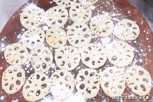 莲藕去皮切成片,均匀撒上淀粉,增加藕片之间的黏合力。