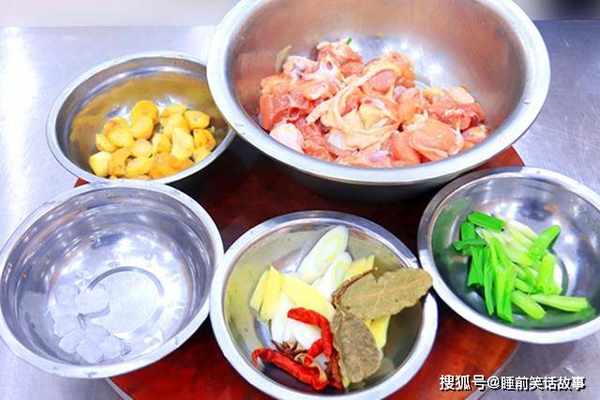 鸡腿洗净、剁成小块,加食盐、葱姜和料酒,用手抓匀腌制30分钟;板栗去壳、只用果仁;蒜苗用刀背拍散、斜刀切成段;再切点葱段、姜片放入碗中,加入一片白芷、两粒八角、两片香叶、几个干辣椒;另外准备适量的冰糖备用。