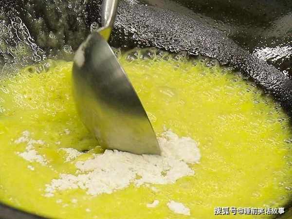 锅里稍微多加一点油,油温烧至五成热时,一勺一勺的加面粉小火勤搅动,把面粉炒香慢慢熬成牛奶状,能挂勺就可以了倒出来备用。