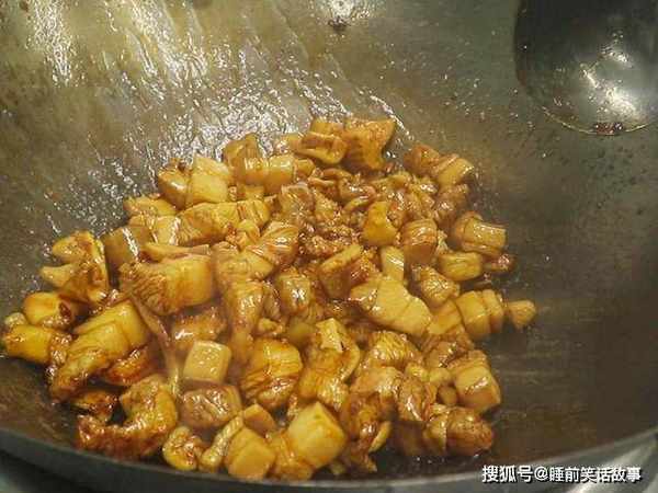 锅里烧油,放入一把白糖炒个糖色,用小火慢慢地把白糖熬化,当糖汁熬成棕红色并且开始起泡的时候,倒入五花肉和猪皮翻炒3-4分钟,让肉的上面都裹上糖色。