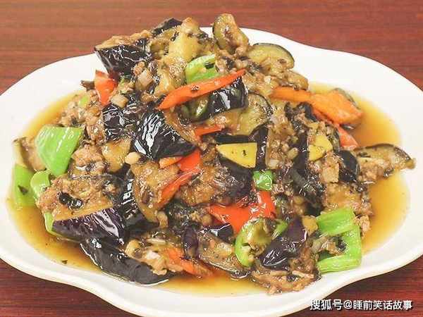 一个青椒和一个红椒去籽切成菱形片;一小碗豆豉,提前泡软的梅菜切碎和豆豉放在一起;两个茄子切成滚刀块。
