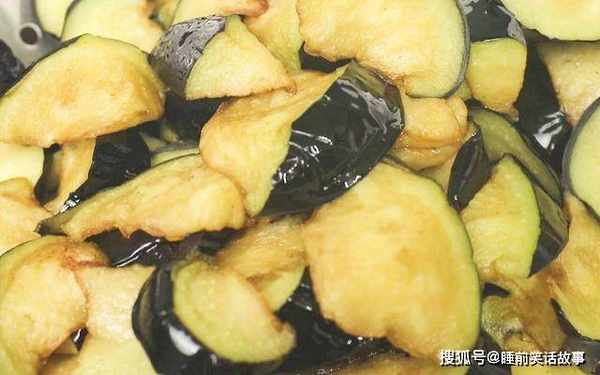 锅内烧油,油温六成热时倒入茄子,茄子高油温下锅能使表皮快速定型,防止吸入太多的油脂,炸的时候经常翻动让茄子均匀受热,茄子炸至表皮金黄以后捞出来控油,不喜欢太油腻的朋友在炸之前可以撒一层淀粉也可以。
