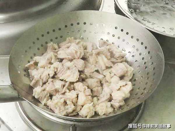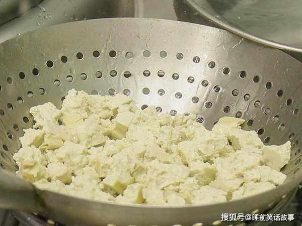 锅里烧水,把豆腐凉水下锅汆煮一下去去豆腥味,煮至开锅就倒出来用凉水冲洗降温。