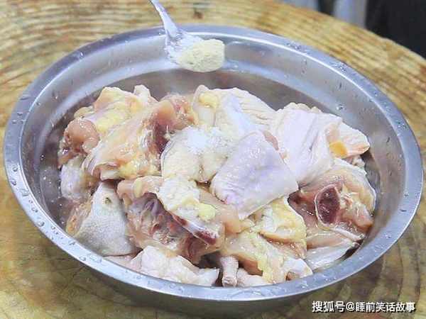 一只三黄鸡剁成小块放在盆中,加入料酒3克,食盐2克,胡椒粉1克搅拌均匀腌制10分钟。