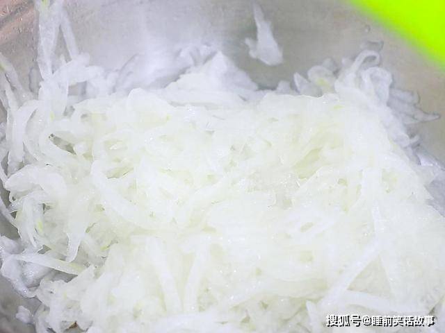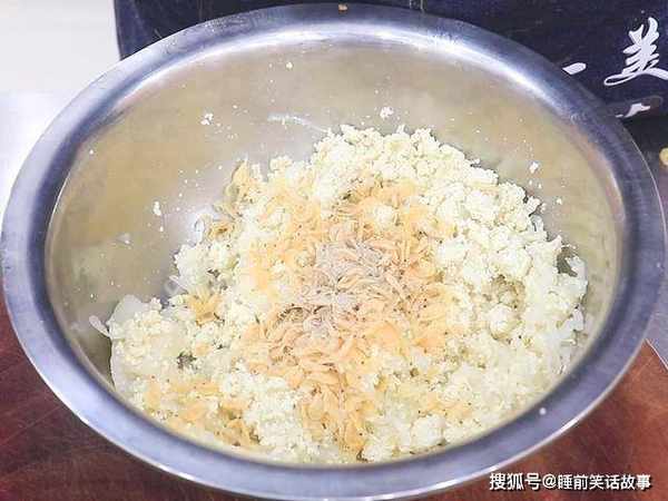 冬瓜丝和豆腐放在一起抓拌均匀,加入一小把虾皮、胡椒粉2克,打入一个鸡蛋继续抓匀,放入半勺面粉、半勺淀粉,和成一个松软的面团。
