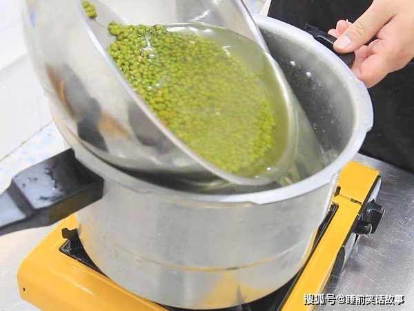 高压锅内放入浸泡好的绿豆、冰糖20克,小火压制十五分钟即可盛出,蒙上保鲜膜放在冰箱里面冰镇半个小时,即可食用。