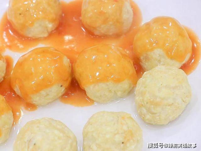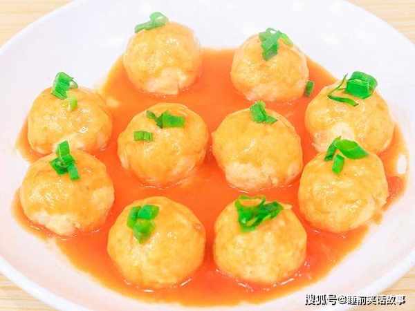 这个时候丸子也蒸熟了,我们把它取出来均匀浇上番茄汁,撒上葱花即成。