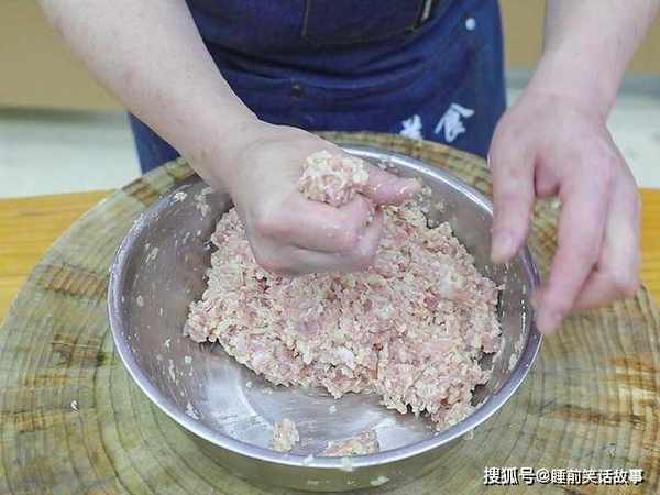 一节莲藕去皮后剁成碎藕丁,把切好的藕丁放入五花肉馅里,加入一个鸡蛋、食盐、胡椒粉、鸡粉、蚝油调味,顺着一个方向充分地搅打,然后淋入一点葱姜水继续搅打,一直把肉馅搅打至上劲,然后抓入一小把淀粉继续搅拌。