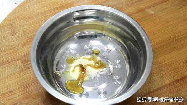 3.下面,我们准备一下凉拌料:准备一个小盆,放入食盐2克,鸡粉2克,芝麻香油3克,加入凉开水用勺子搅拌均匀备用。
