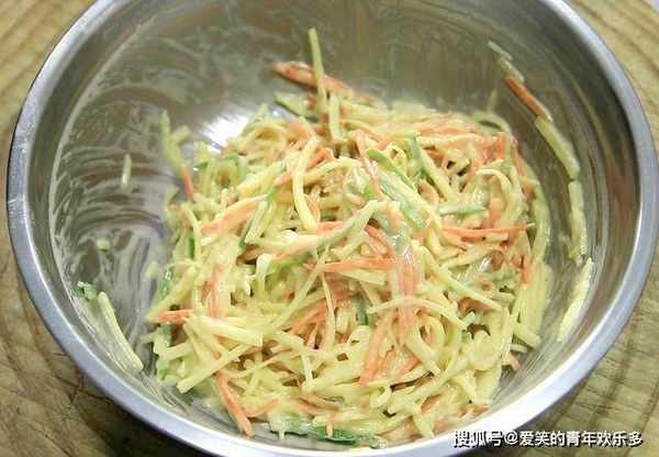 1.准备土豆两个,把外皮削干净,先切成薄片,再切成细丝放入盆中。胡萝卜半根,也切成细丝。再切点青椒丝放在一起,主要用来配色。